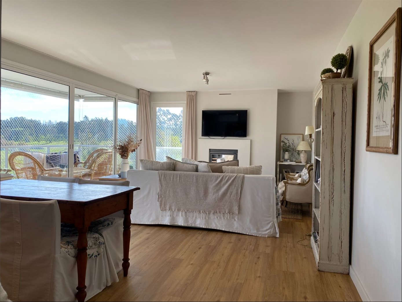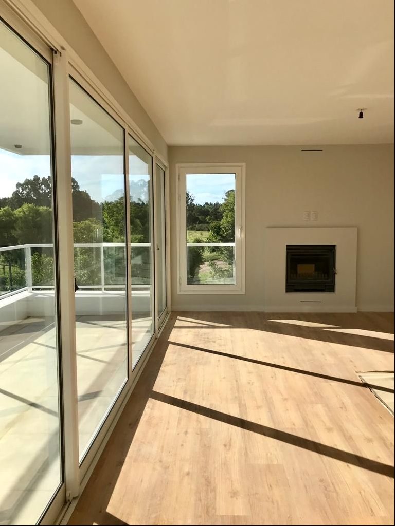 Living comedor con estufa de alto rendimiento y salida a terraza con parrillero.