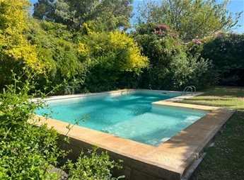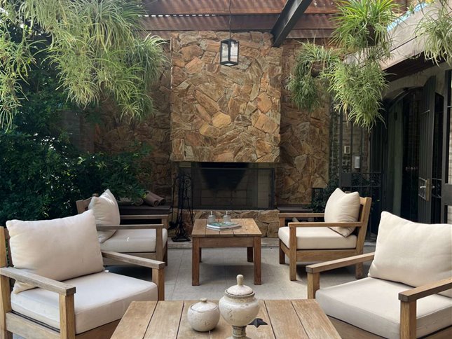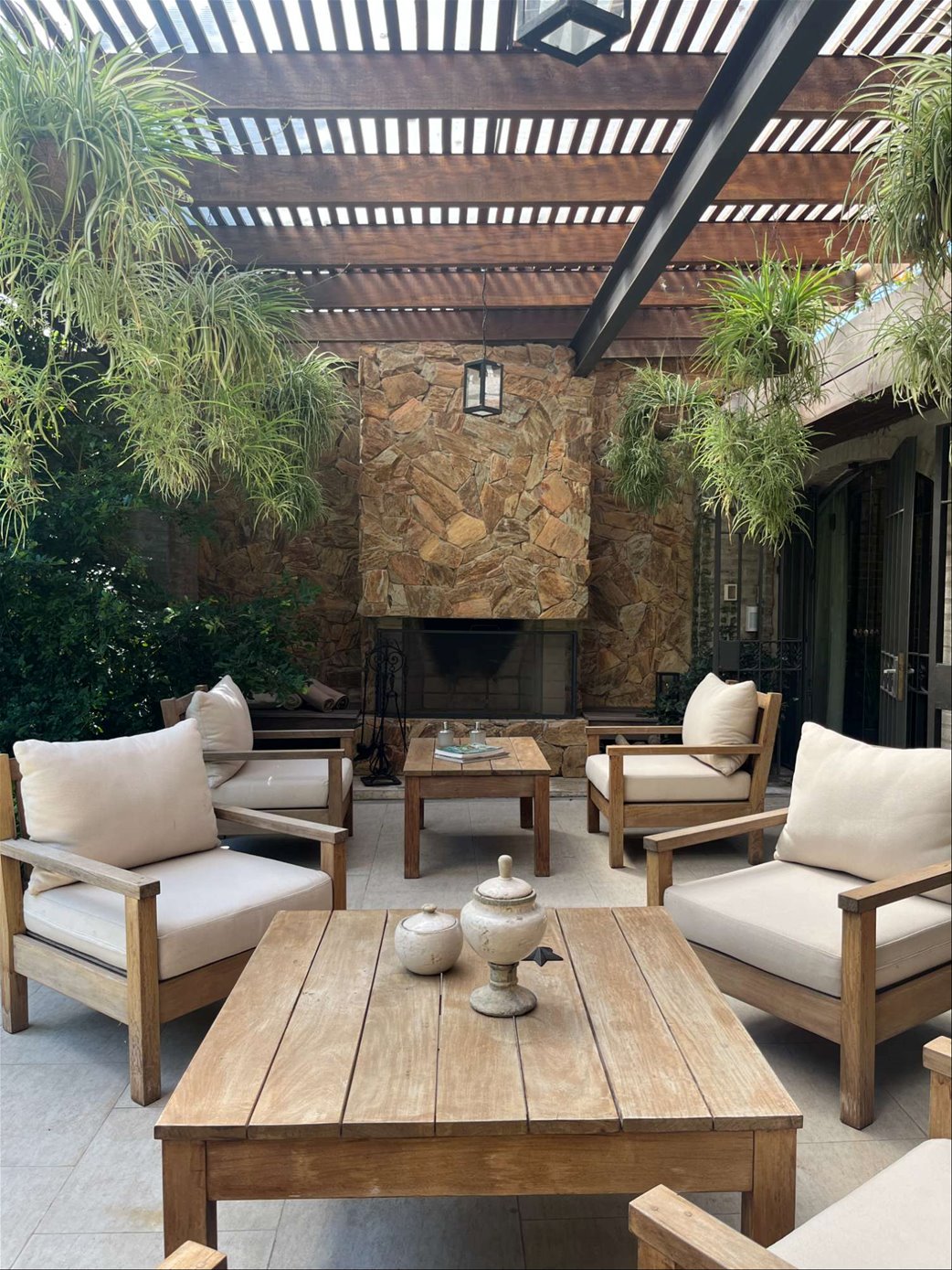 Galería exterior techada con estufa a leña que forma un buen entorno con la piscina.