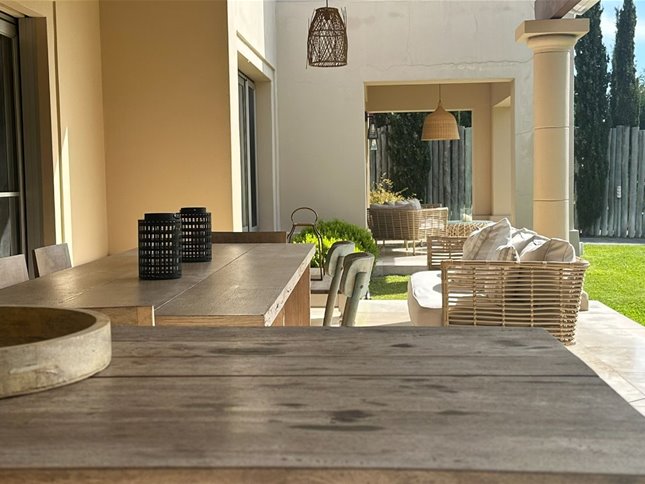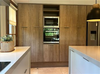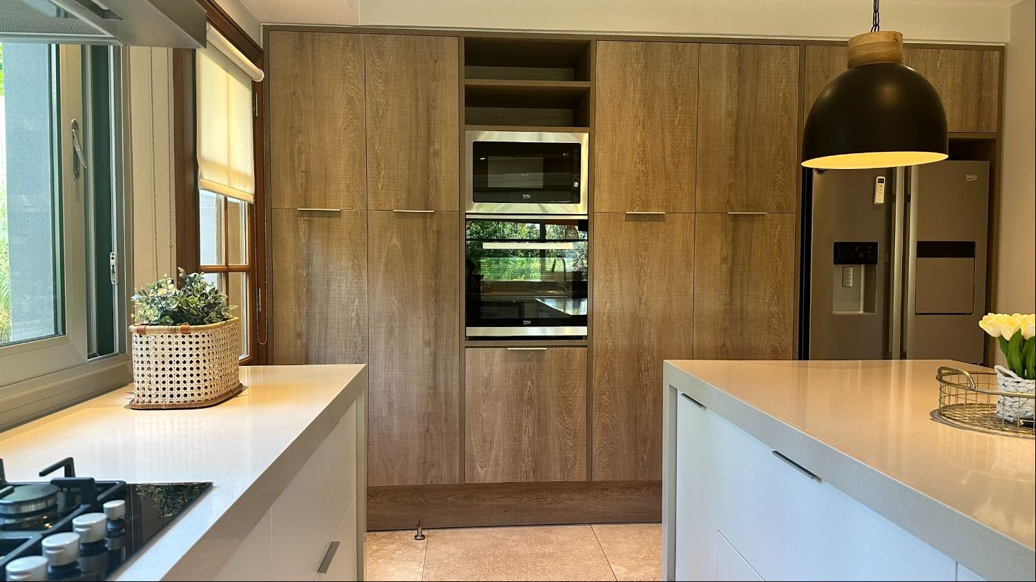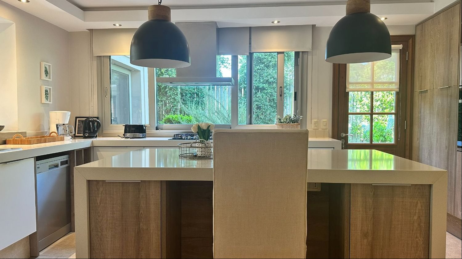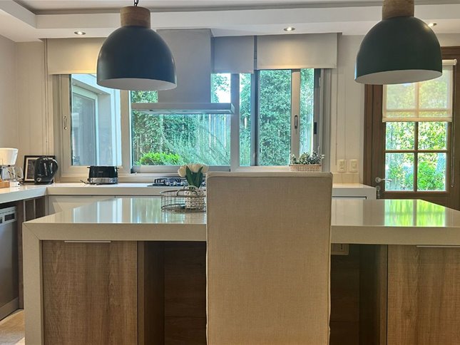 Cocina (equipada con horno, anafe y campana) integrada al estar mediante barra, cuenta con isla y área de comedor diario, salida a patio lateral.