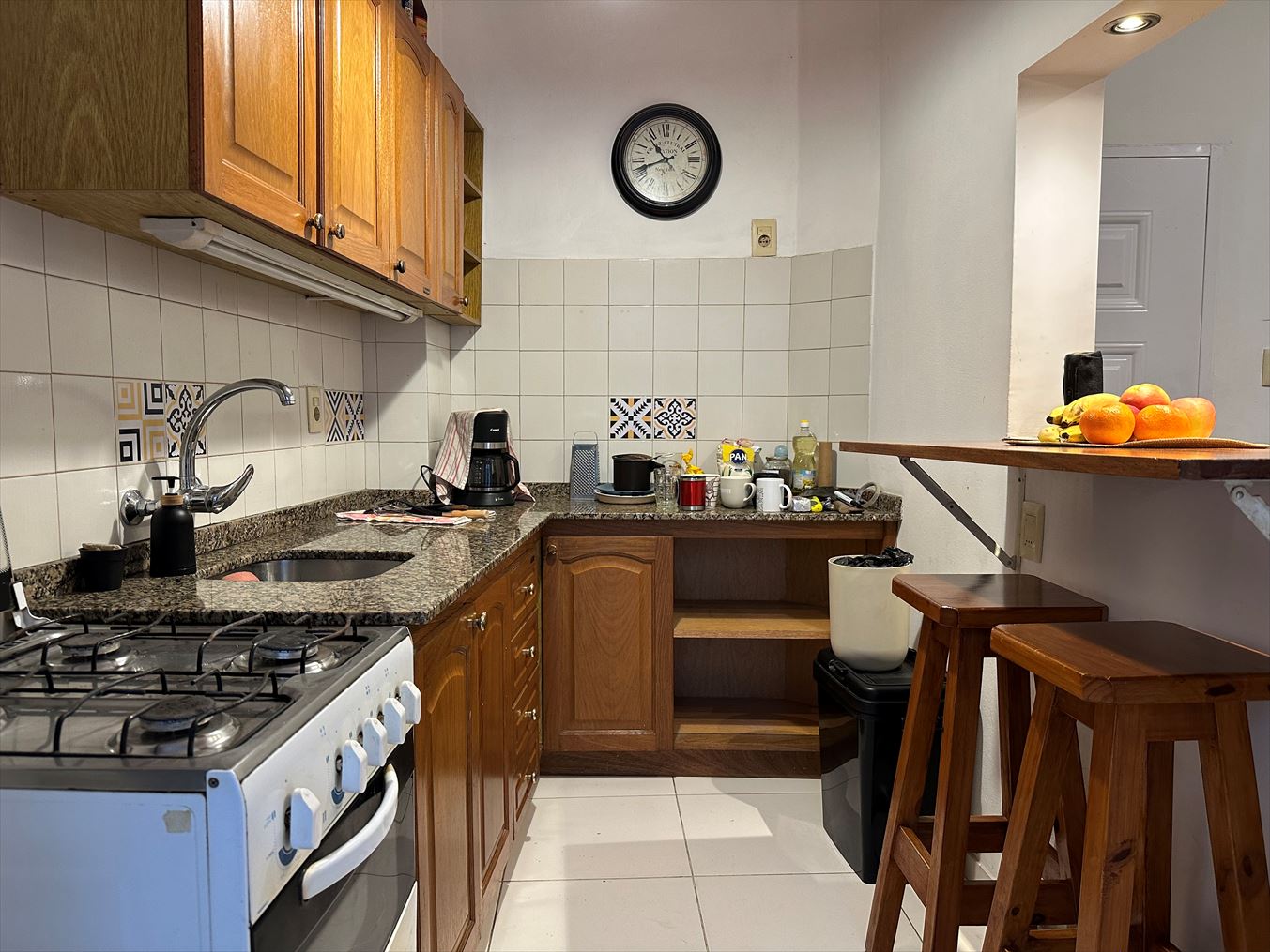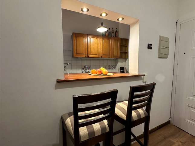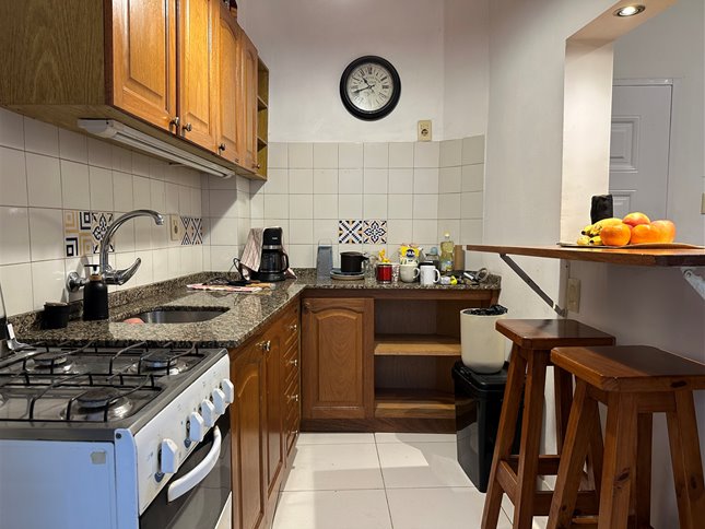 Cocina cómoda con barra y placares sobre y bajo mesada