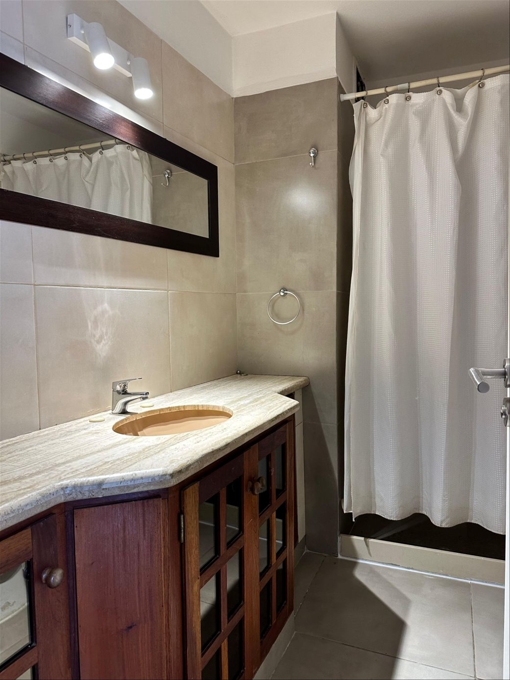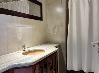 Living comedor con estufa a leña. Baño social. Cocina definida con barra y comedor diario, con salida a patio con parrillero.